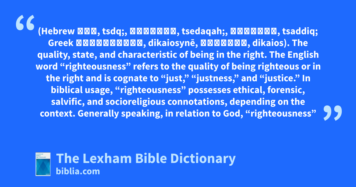 The English word “righteousness” refers to the quality of being righteous or in the right and is cognate to “just,” “justness,” and “justice.” In biblical usage, “righteousness” possesses ethical, forensic, salvific, and socioreligious connotations, depending on the context. Generally speaking, in relation to God, “righteousness” can refer to a divine attribute or to a divine activity, while in relation to human subjects, “righteousness” primarily denotes a legal and social status or a moral state.