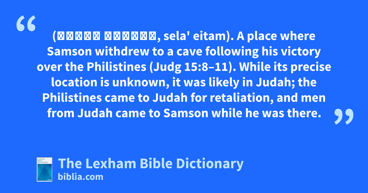 Etam, Rock Of (סֶלַע עֵיטָם, sela' eitam). A place where Samson withdrew to a cave following his victory over the Philistines (Judg 15:8–11). While its precise location is unknown, it was likely in Judah; the Philistines came to Judah for retaliation, and men from Judah came to Samson while he was there.