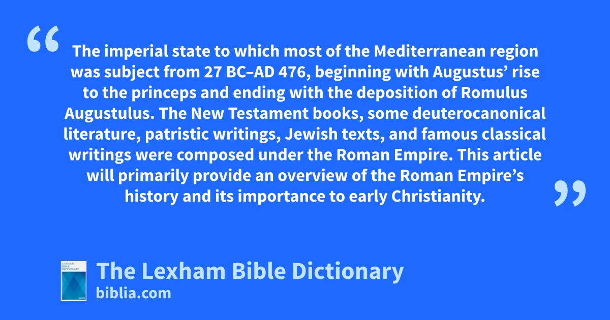 Roman Empire The imperial state to which most of the Mediterranean region was subject from 27 bc–ad 476, beginning with Augustus’ rise to the princeps and ending with the deposition of Romulus Augustulus. The New Testament books, some deuterocanonical literature, patristic writings, Jewish texts, and famous classical writings were composed under the Roman Empire. This article will primarily provide an overview of the Roman Empire’s history and its importance to early Christianity.