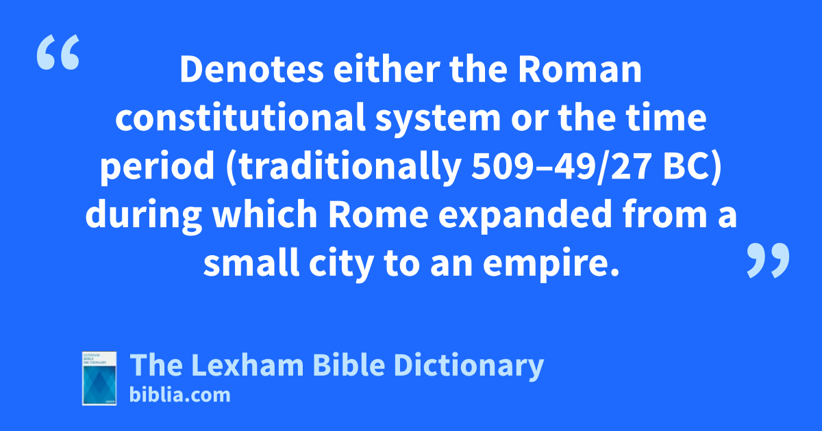 Rome, Republic Of Denotes either the Roman constitutional system or the time period (traditionally 509–49/27 bc) during which Rome expanded from a small city to an empire.