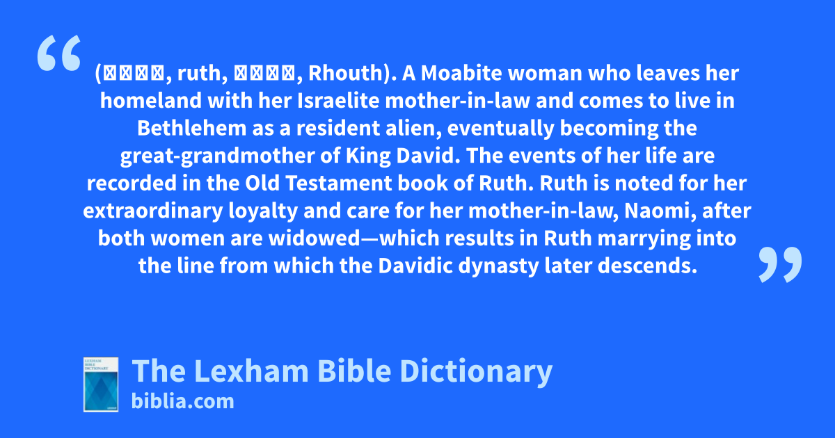 Ruth (רוּת, ruth, Ῥούθ, Rhouth). A Moabite woman who leaves her homeland with her Israelite mother-in-law and comes to live in Bethlehem as a resident alien, eventually becoming the great-grandmother of King David. The events of her life are recorded in the Old Testament book of Ruth. Ruth is noted for her extraordinary loyalty and care for her mother-in-law, Naomi, after both women are widowed—which results in Ruth marrying into the line from which the Davidic dynasty later descends.