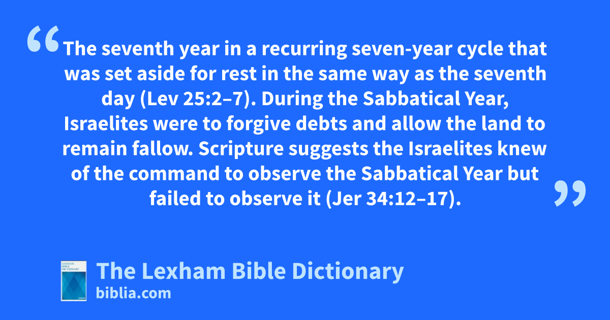 Sabbatical Year The seventh year in a recurring seven-year cycle that was set aside for rest in the same way as the seventh day (Lev 25:2–7). During the Sabbatical Year, Israelites were to forgive debts and allow the land to remain fallow. Scripture suggests the Israelites knew of the command to observe the Sabbatical Year but failed to observe it (Jer 34:12–17).