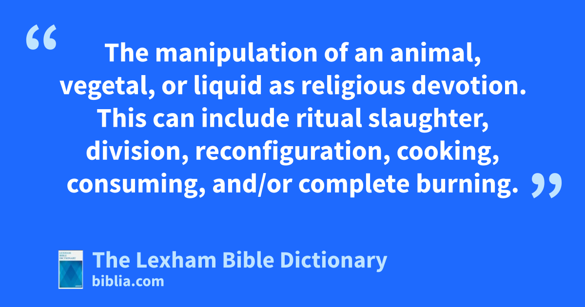 Sacrifice in the Old Testament The manipulation of an animal, vegetal, or liquid as religious devotion. This can include ritual slaughter, division, reconfiguration, cooking, consuming, and/or complete burning.