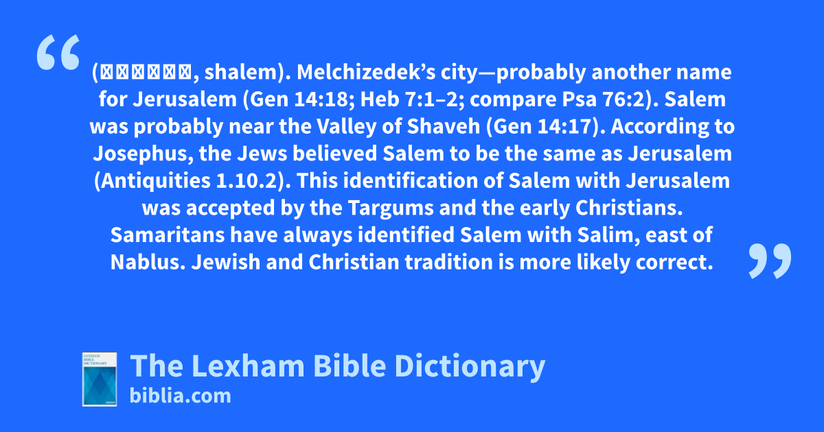 Salem (שָׁלֵם, shalem). Melchizedek’s city—probably another name for Jerusalem (Gen 14:18; Heb 7:1–2; compare Psa 76:2). Salem was probably near the Valley of Shaveh (Gen 14:17). According to Josephus, the Jews believed Salem to be the same as Jerusalem (Antiquities 1.10.2). This identification of Salem with Jerusalem was accepted by the Targums and the early Christians. Samaritans have always identified Salem with Salim, east of Nablus. Jewish and Christian tradition is more likely correct.