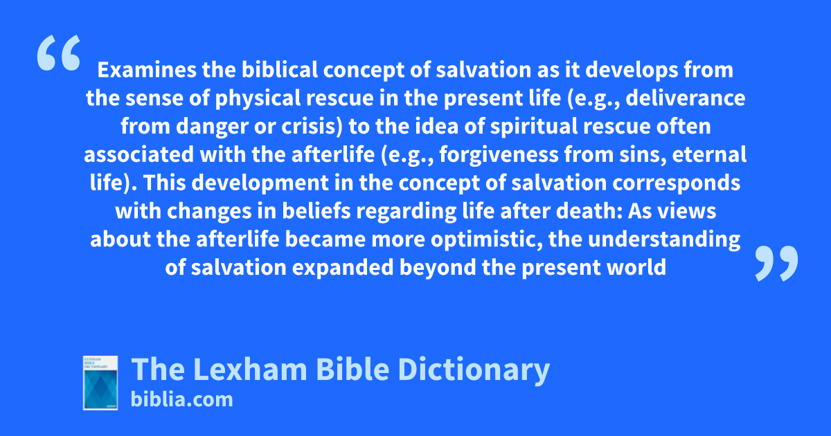 Salvation Examines the biblical concept of salvation as it develops from the sense of physical rescue in the present life (e.g., deliverance from danger or crisis) to the idea of spiritual rescue often associated with the afterlife (e.g., forgiveness from sins, eternal life). This development in the concept of salvation corresponds with changes in beliefs regarding life after death: As views about the afterlife became more optimistic, the understanding of salvation expanded beyond the present world to include hopes for divine deliverance and even resurrection in the world to come.