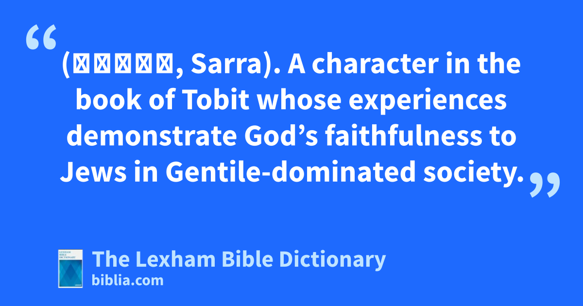 Sarah, Wife of Tobias (Σαρρα, Sarra). A character in the book of Tobit whose experiences demonstrate God’s faithfulness to Jews in Gentile-dominated society.