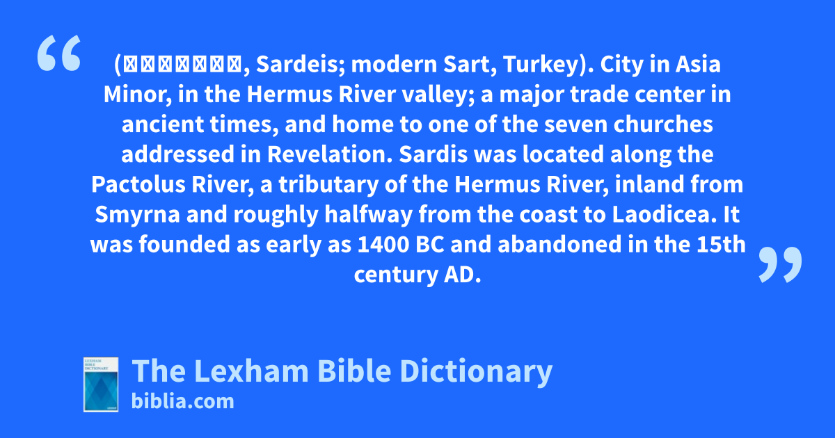 Sardis (Σάρδεις, Sardeis; modern Sart, Turkey). City in Asia Minor, in the Hermus River valley; a major trade center in ancient times, and home to one of the seven churches addressed in Revelation. Sardis was located along the Pactolus River, a tributary of the Hermus River, inland from Smyrna and roughly halfway from the coast to Laodicea. It was founded as early as 1400 bc and abandoned in the 15th century ad.