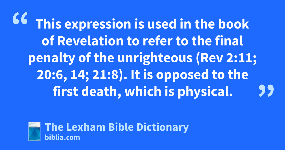Second Death This expression is used in the book of Revelation to refer to the final penalty of the unrighteous (Rev 2:11; 20:6, 14; 21:8). It is opposed to the first death, which is physical.