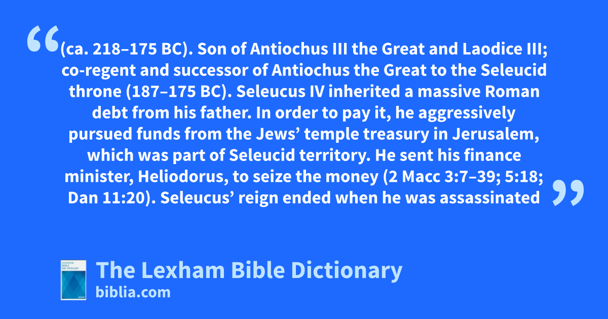 Seleucus IV Philopator (ca. 218–175 bc). Son of Antiochus III the Great and Laodice III; co-regent and successor of Antiochus the Great to the Seleucid throne (187–175 bc). Seleucus IV inherited a massive Roman debt from his father. In order to pay it, he aggressively pursued funds from the Jews’ temple treasury in Jerusalem, which was part of Seleucid territory. He sent his finance minister, Heliodorus, to seize the money (2 Macc 3:7–39; 5:18; Dan 11:20). Seleucus’ reign ended when he was assassinated by a usurping Heliodorus, who barely reigned before Antiochus IV Epiphanes deposed him (175 bc).