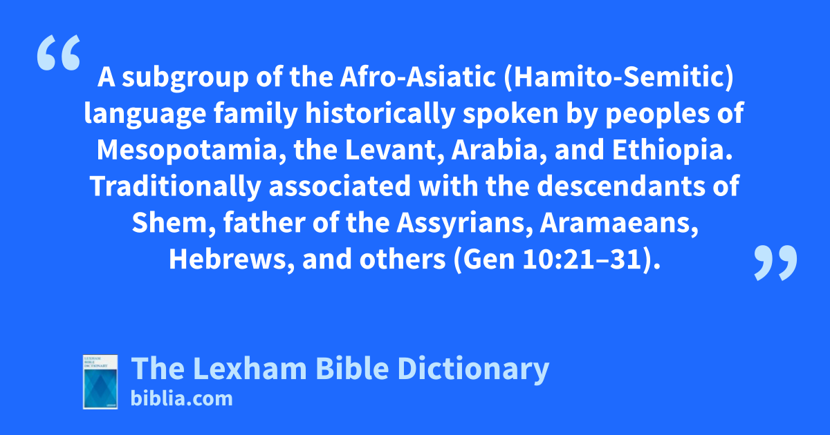 Semitic Languages A subgroup of the Afro-Asiatic (Hamito-Semitic) language family historically spoken by peoples of Mesopotamia, the Levant, Arabia, and Ethiopia. Traditionally associated with the descendants of Shem, father of the Assyrians, Aramaeans, Hebrews, and others (Gen 10:21–31).