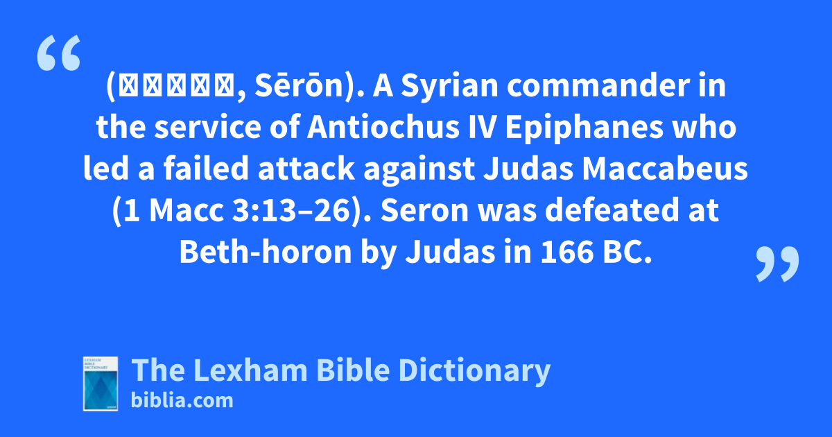 Seron (Σήρων, Sērōn). A Syrian commander in the service of Antiochus IV Epiphanes who led a failed attack against Judas Maccabeus (1 Macc 3:13–26). Seron was defeated at Beth-horon by Judas in 166 bc.