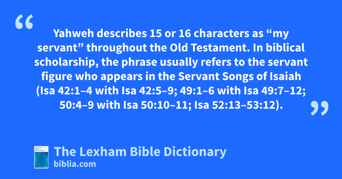 Servant of the Lord Yahweh describes 15 or 16 characters as “my servant” throughout the Old Testament. In biblical scholarship, the phrase usually refers to the servant figure who appears in the Servant Songs of Isaiah (Isa 42:1–4 with Isa 42:5–9; 49:1–6 with Isa 49:7–12; 50:4–9 with Isa 50:10–11; Isa 52:13–53:12).