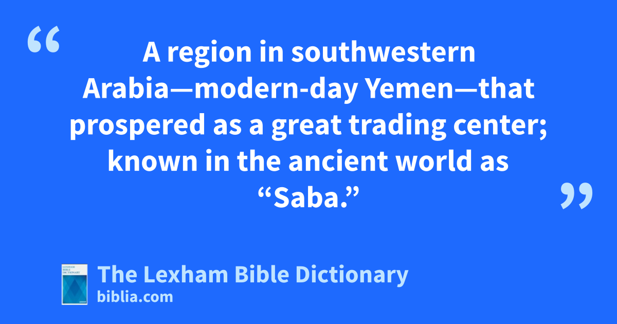 Sheba of Arabia A region in southwestern Arabia—modern-day Yemen—that prospered as a great trading center; known in the ancient world as “Saba.”
