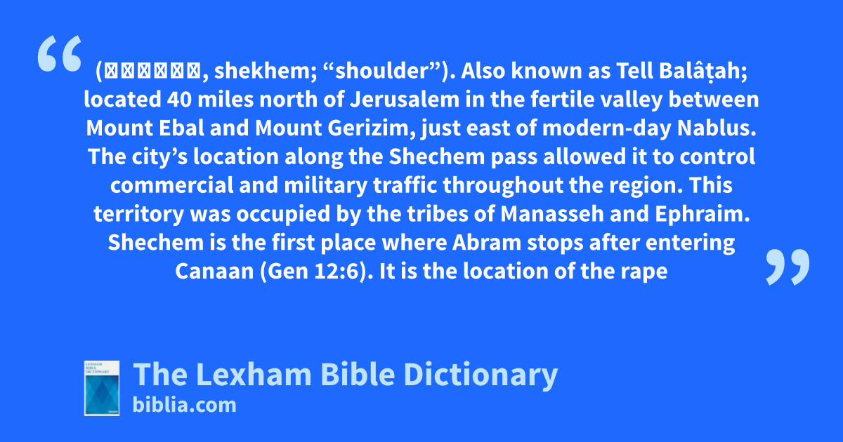 Shechem, City Of (שְׁכֶם, shekhem; “shoulder”). Also known as Tell Balâṭah; located 40 miles north of Jerusalem in the fertile valley between Mount Ebal and Mount Gerizim, just east of modern-day Nablus. The city’s location along the Shechem pass allowed it to control commercial and military traffic throughout the region. This territory was occupied by the tribes of Manasseh and Ephraim.