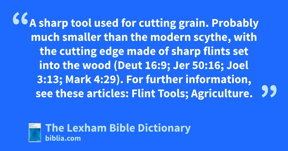 Sickle A sharp tool used for cutting grain. Probably much smaller than the modern scythe, with the cutting edge made of sharp flints set into the wood (Deut 16:9; Jer 50:16; Joel 3:13; Mark 4:29). For further information, see these articles: Flint Tools; Agriculture.