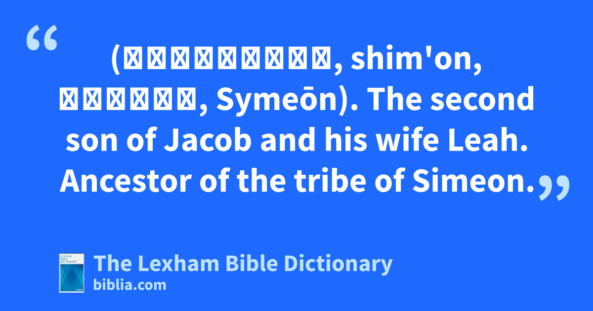 Simeon, Son of Jacob (שִׁמְעוֹן, shim'on, Συμεών, Symeōn). The second son of Jacob and his wife Leah. Ancestor of the tribe of Simeon.