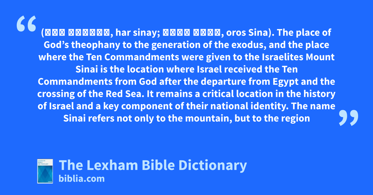 Sinai, Mount (הַר סִינָי, har sinay; ὄρος Σινᾶ, oros Sina). The place of God’s theophany to the generation of the exodus, and the place where the Ten Commandments were given to the Israelites