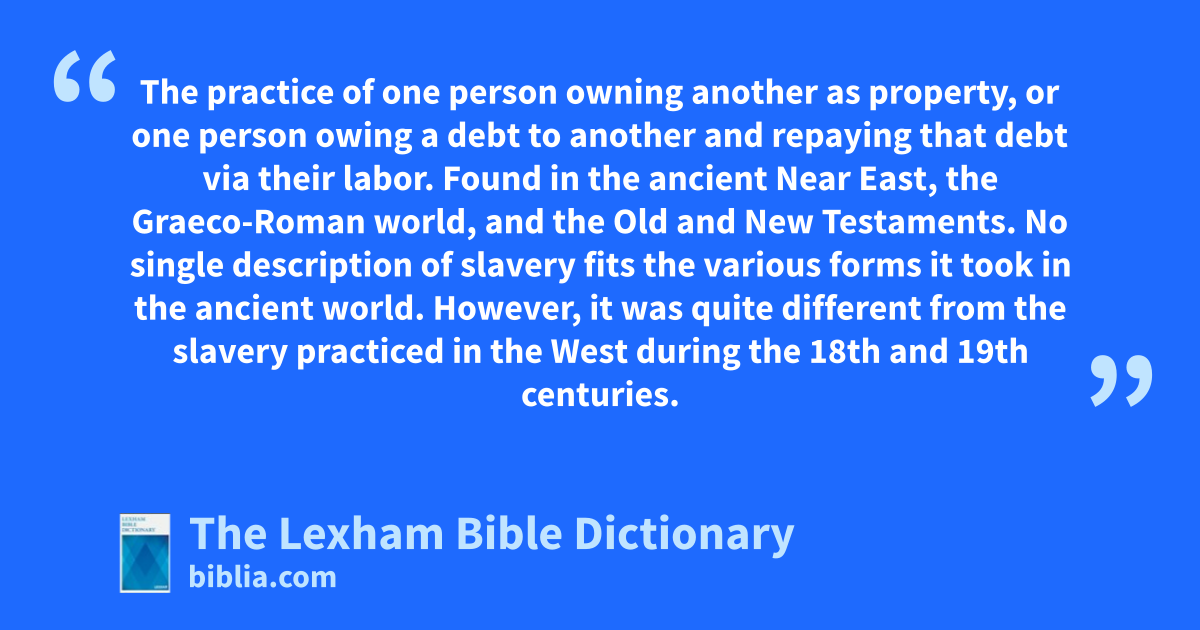 Slavery The practice of one person owning another as property, or one person owing a debt to another and repaying that debt via their labor. Found in the ancient Near East, the Graeco-Roman world, and the Old and New Testaments. No single description of slavery fits the various forms it took in the ancient world. However, it was quite different from the slavery practiced in the West during the 18th and 19th centuries.