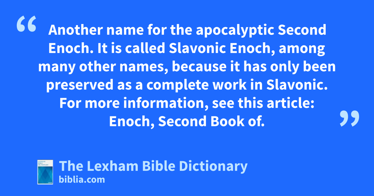Slavonic Enoch Another name for the apocalyptic Second Enoch. It is called Slavonic Enoch, among many other names, because it has only been preserved as a complete work in Slavonic. For more information, see this article: Enoch, Second Book of.