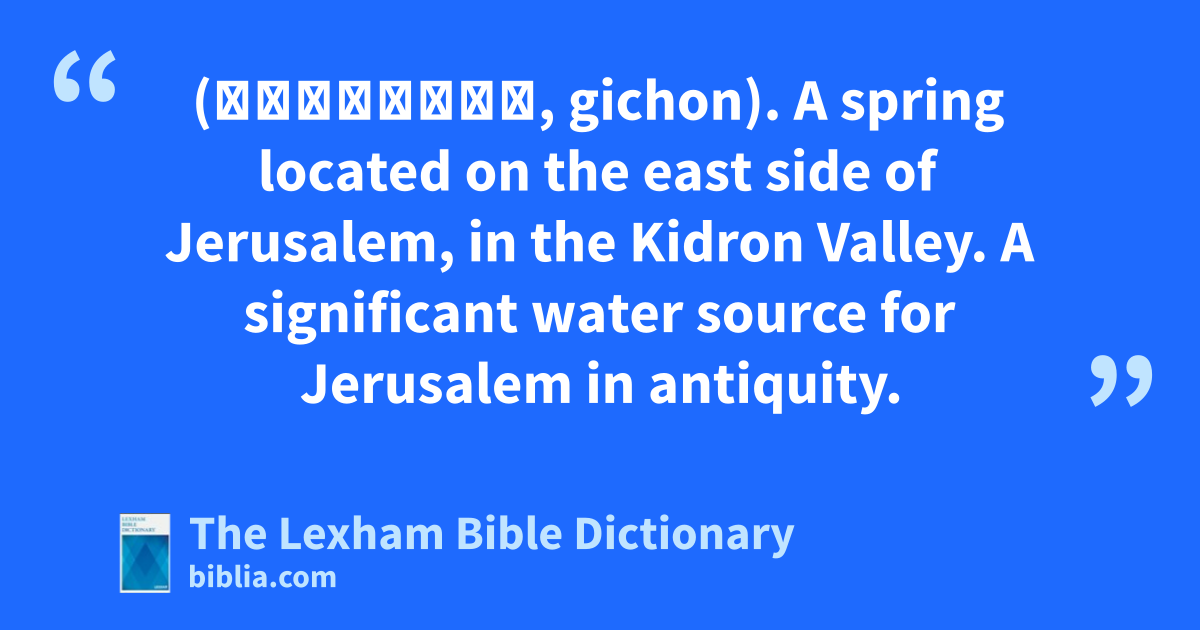 Gihon, Spring Of (גִּיחוֹן, gichon). A spring located on the east side of Jerusalem, in the Kidron Valley. A significant water source for Jerusalem in antiquity.
