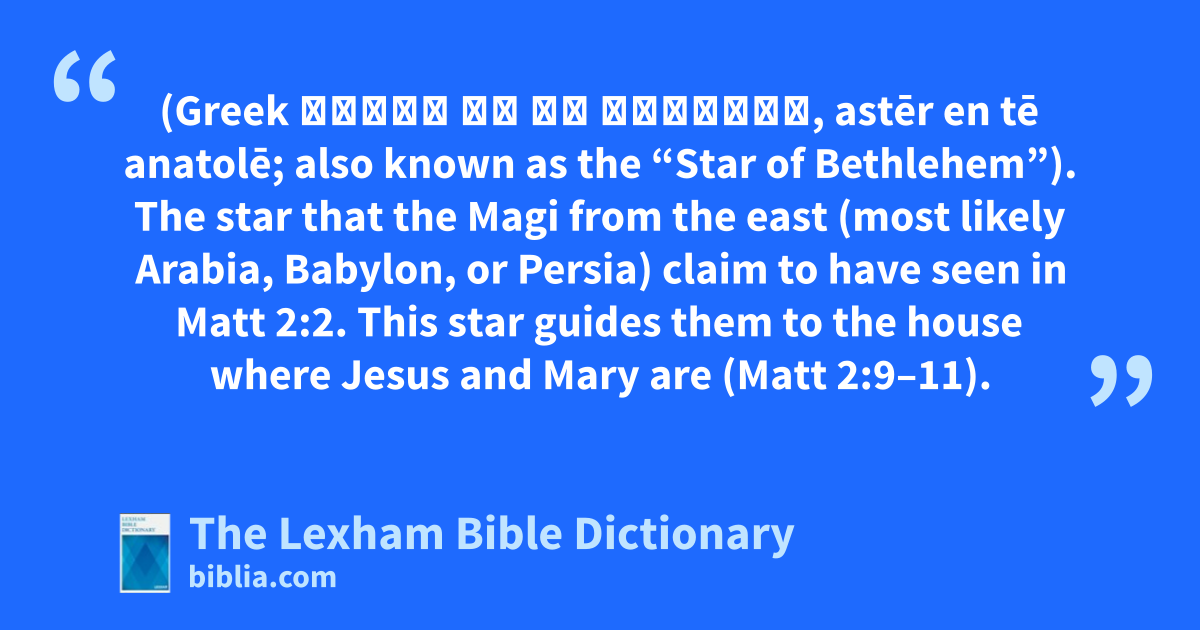 Star in the East (Greek ἀστήρ ἐν τῇ ἀνατολῇ, astēr en tē anatolē; also known as the “Star of Bethlehem”). The star that the Magi from the east (most likely Arabia, Babylon, or Persia) claim to have seen in Matt 2:2. This star guides them to the house where Jesus and Mary are (Matt 2:9–11).