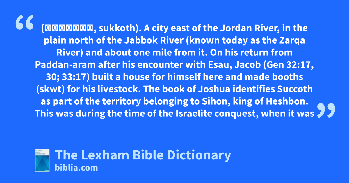 Succoth on the Jordan (סֻכּוֹת, sukkoth). A city east of the Jordan River, in the plain north of the Jabbok River (known today as the Zarqa River) and about one mile from it. On his return from Paddan-aram after his encounter with Esau, Jacob (Gen 32:17, 30; 33:17) built a house for himself here and made booths (skwt) for his livestock.