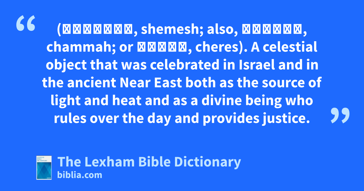 Sun (שֶׁמֶשׁ, shemesh; also, חַמָּה, chammah; or חֶרֶס, cheres). A celestial object that was celebrated in Israel and in the ancient Near East both as the source of light and heat and as a divine being who rules over the day and provides justice.