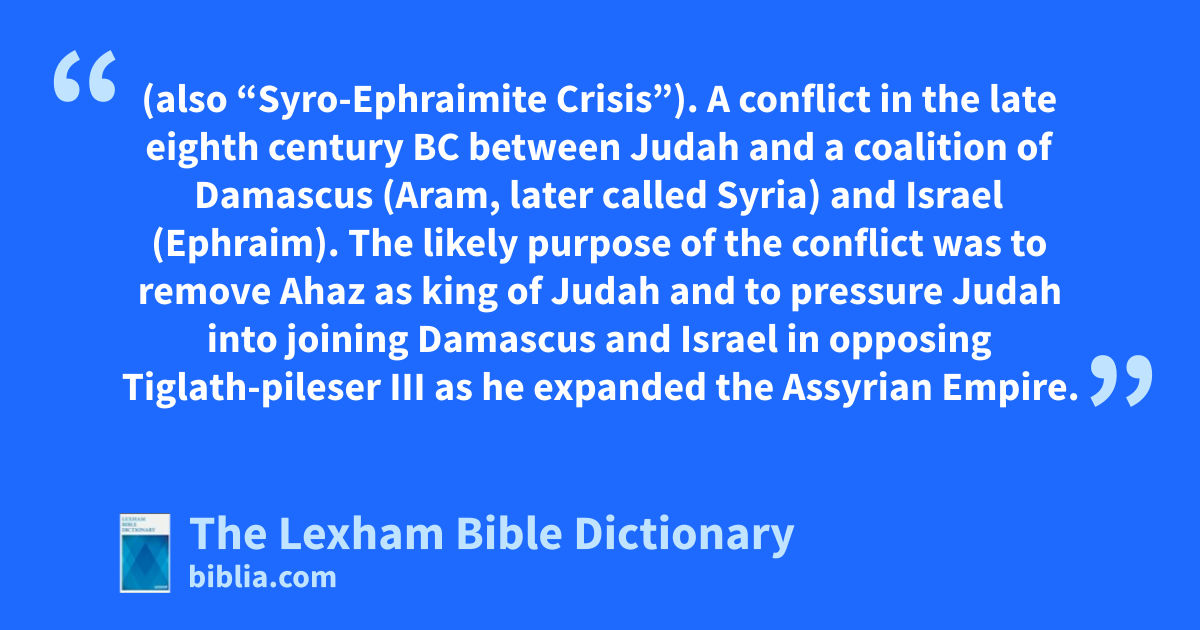 Syro-Ephraimite War (also “Syro-Ephraimite Crisis”). A conflict in the late eighth century bc between Judah and a coalition of Damascus (Aram, later called Syria) and Israel (Ephraim). The likely purpose of the conflict was to remove Ahaz as king of Judah and to pressure Judah into joining Damascus and Israel in opposing Tiglath-pileser III as he expanded the Assyrian Empire.