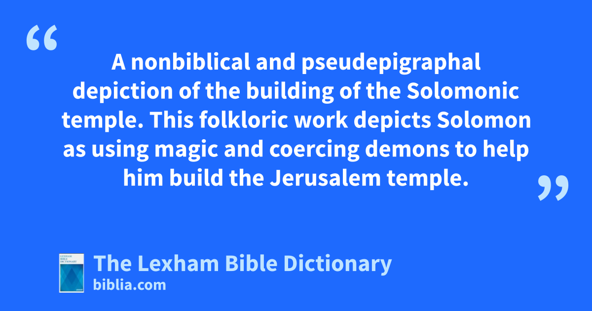 Testament of Solomon A nonbiblical and pseudepigraphal depiction of the building of the Solomonic temple. This folkloric work depicts Solomon as using magic and coercing demons to help him build the Jerusalem temple.