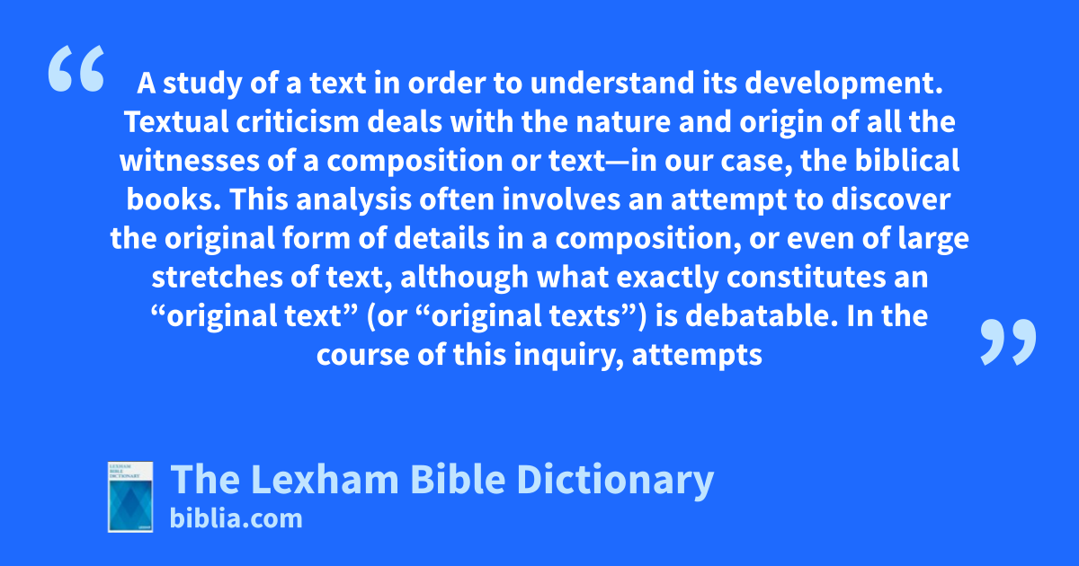 Textual Criticism of the Hebrew Bible, Methodology A study of a text in order to understand its development. Textual criticism deals with the nature and origin of all the witnesses of a composition or text—in our case, the biblical books. This analysis often involves an attempt to discover the original form of details in a composition, or even of large stretches of text, although what exactly constitutes an “original text” (or “original texts”) is debatable.