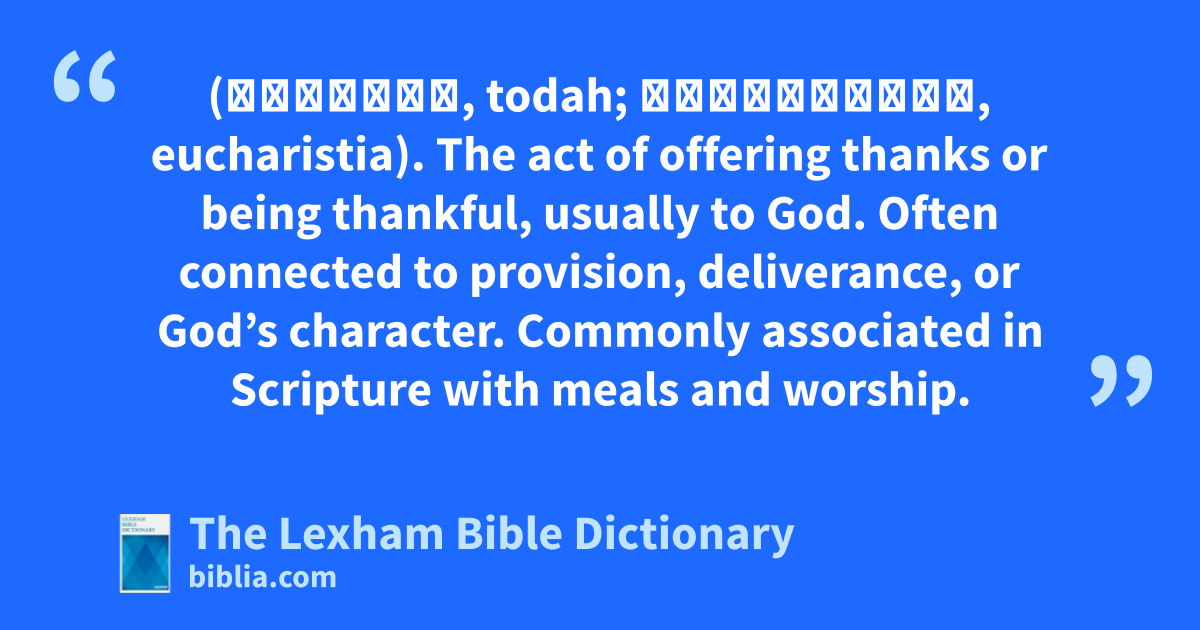 Thanksgiving (תּוֹדָה, todah; εὐχαριστία, eucharistia). The act of offering thanks or being thankful, usually to God. Often connected to provision, deliverance, or God’s character. Commonly associated in Scripture with meals and worship.