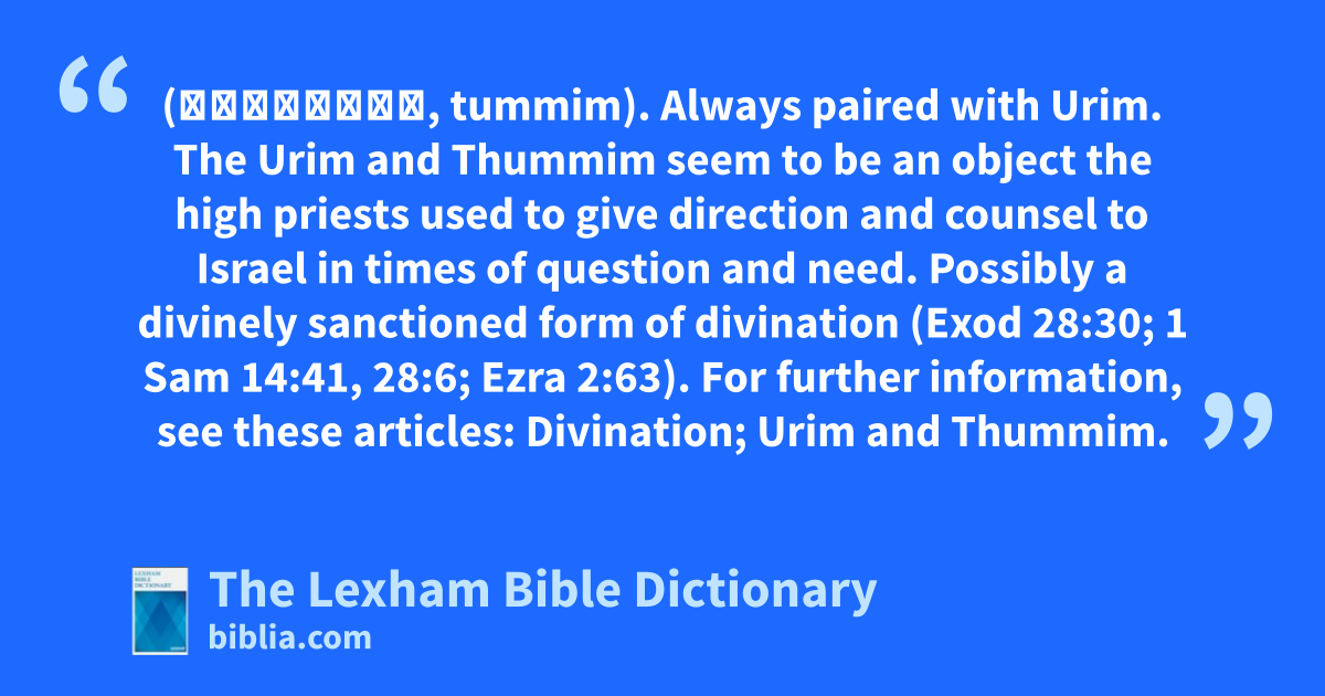 Thummim (תֻּמִּים, tummim). Always paired with Urim. The Urim and Thummim seem to be an object the high priests used to give direction and counsel to Israel in times of question and need. Possibly a divinely sanctioned form of divination (Exod 28:30; 1 Sam 14:41, 28:6; Ezra 2:63). For further information, see these articles: Divination; Urim and Thummim.