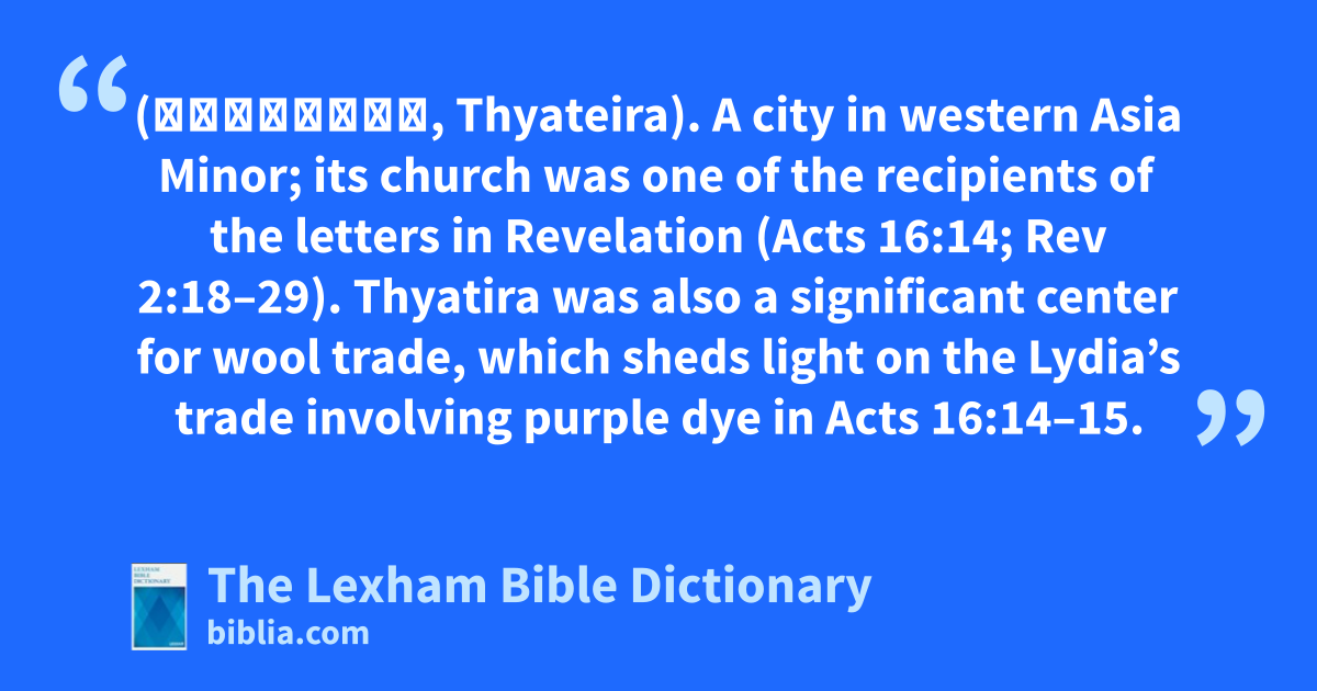 Thyatira (Θυάτειρα, Thyateira). A city in western Asia Minor; its church was one of the recipients of the letters in Revelation (Acts 16:14; Rev 2:18–29). Thyatira was also a significant center for wool trade, which sheds light on the Lydia’s trade involving purple dye in Acts 16:14–15.