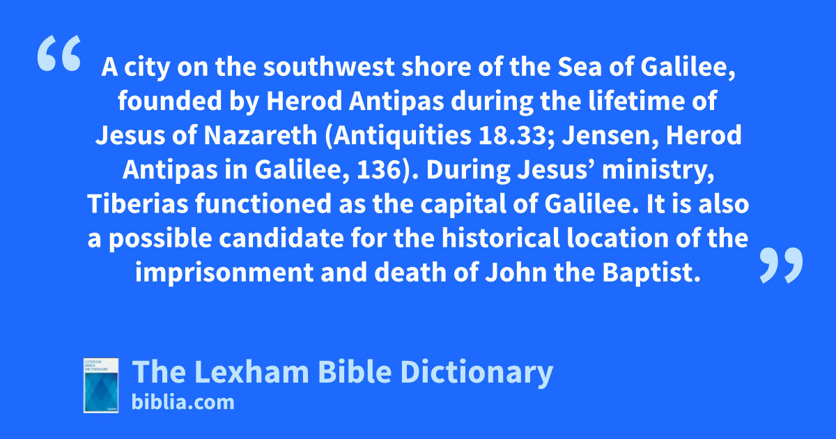 Tiberias A city on the southwest shore of the Sea of Galilee, founded by Herod Antipas during the lifetime of Jesus of Nazareth (Antiquities 18.33; Jensen, Herod Antipas in Galilee, 136). During Jesus’ ministry, Tiberias functioned as the capital of Galilee. It is also a possible candidate for the historical location of the imprisonment and death of John the Baptist.