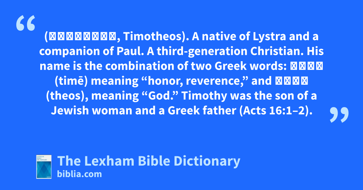 Timothy (Τιμόθεος, Timotheos). A native of Lystra and a companion of Paul. A third-generation Christian. His name is the combination of two Greek words: τιμή (timē) meaning “honor, reverence,” and θεός (theos), meaning “God.” Timothy was the son of a Jewish woman and a Greek father (Acts 16:1–2).