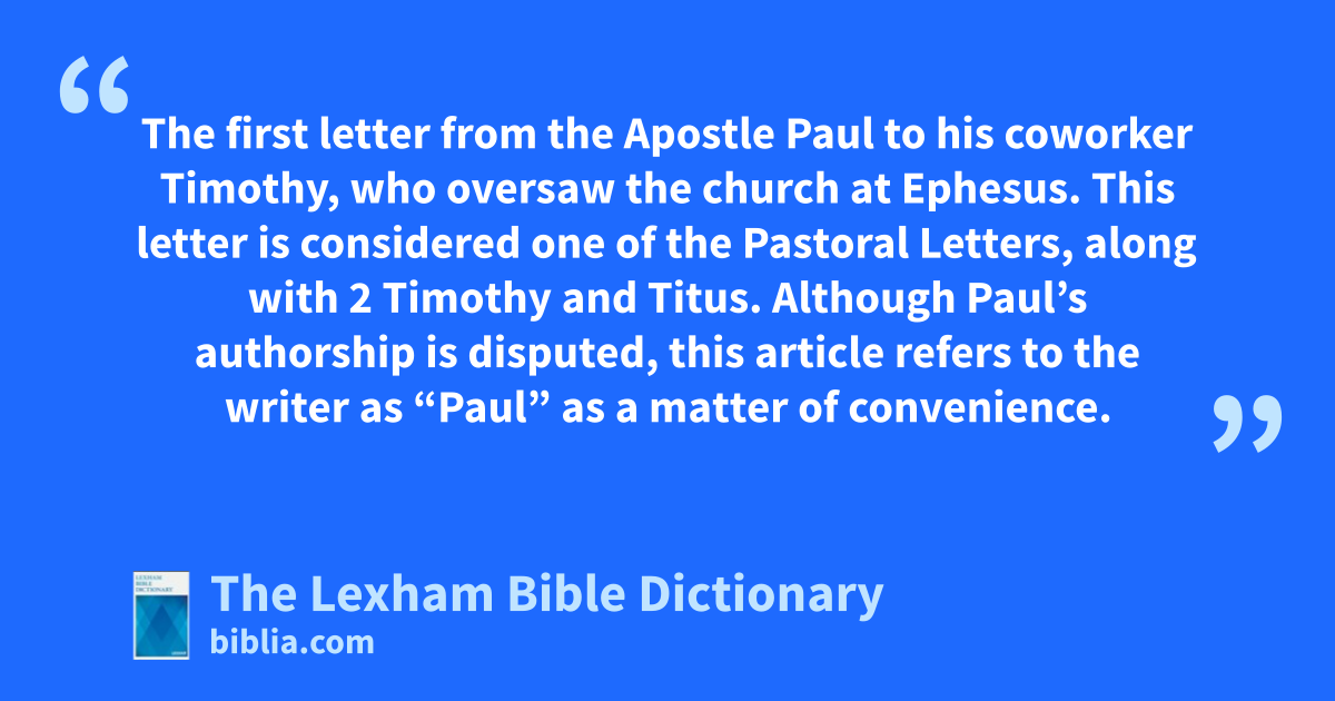 Timothy, First Letter To The first letter from the Apostle Paul to his coworker Timothy, who oversaw the church at Ephesus. This letter is considered one of the Pastoral Letters, along with 2 Timothy and Titus. Although Paul’s authorship is disputed, this article refers to the writer as “Paul” as a matter of convenience.
