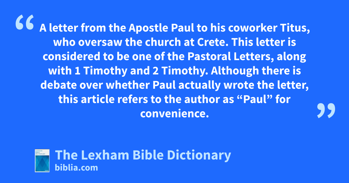 Titus, Letter To A letter from the Apostle Paul to his coworker Titus, who oversaw the church at Crete. This letter is considered to be one of the Pastoral Letters, along with 1 Timothy and 2 Timothy. Although there is debate over whether Paul actually wrote the letter, this article refers to the author as “Paul” for convenience.