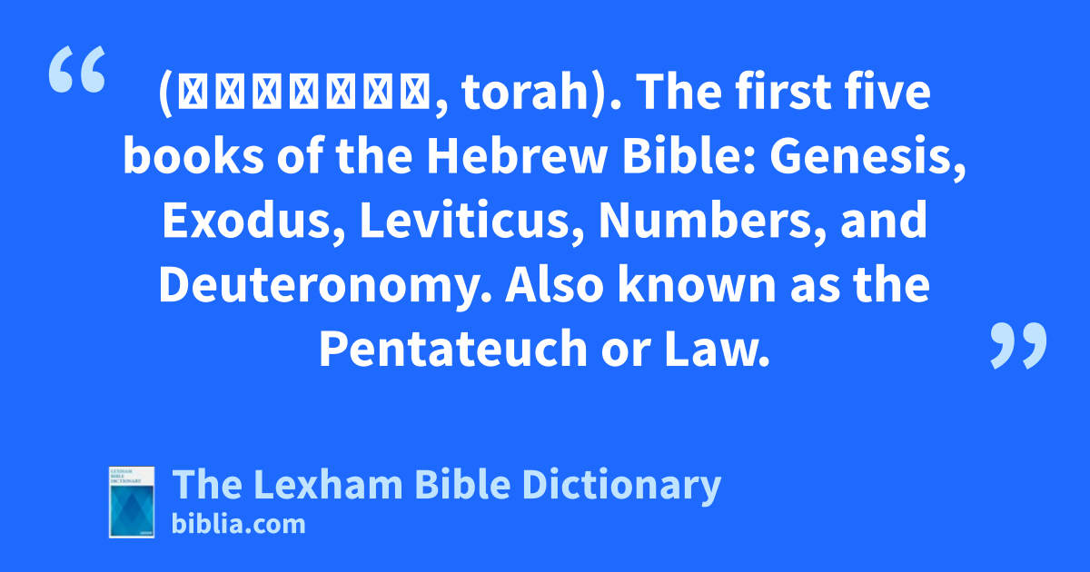 Torah (תּוֹרָה, torah). The first five books of the Hebrew Bible: Genesis, Exodus, Leviticus, Numbers, and Deuteronomy. Also known as the Pentateuch or Law.