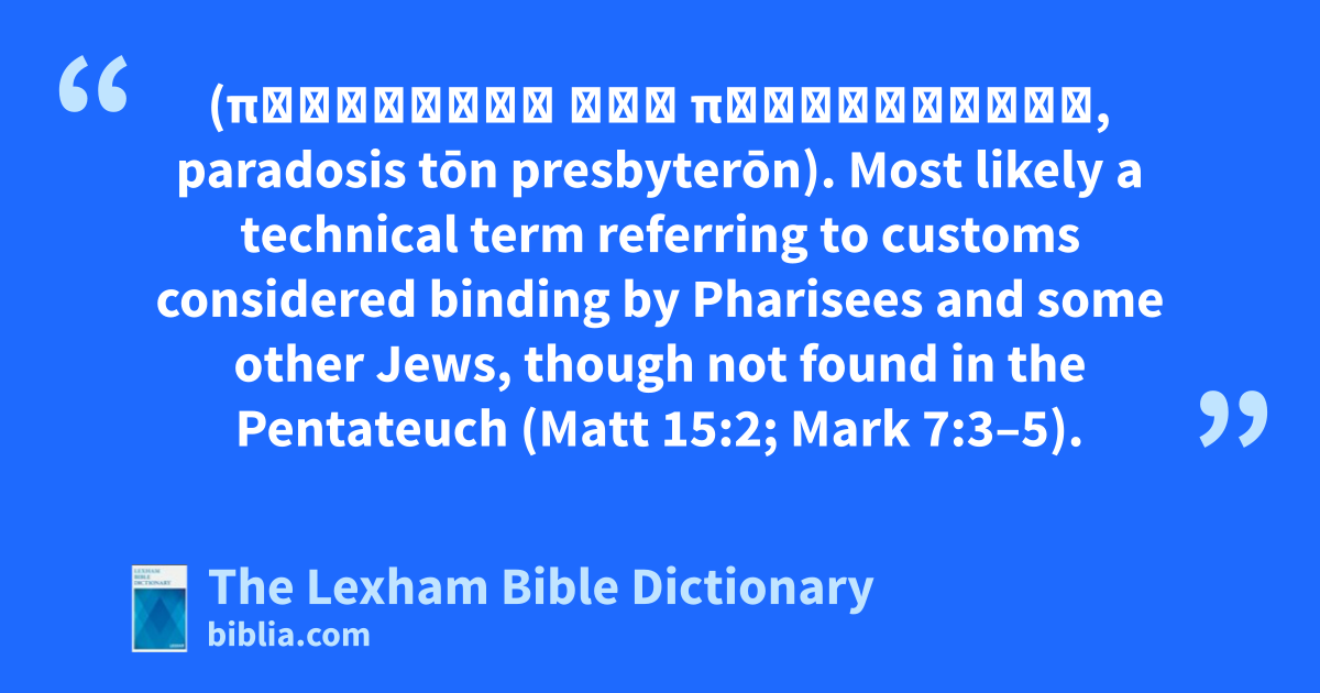 Tradition of the Elders (παράδοσις τῶν πρεσβυτέρων, paradosis tōn presbyterōn). Most likely a technical term referring to customs considered binding by Pharisees and some other Jews, though not found in the Pentateuch (Matt 15:2; Mark 7:3–5).