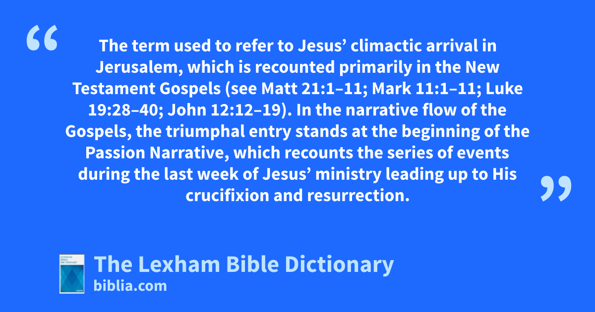 Triumphal Entry The term used to refer to Jesus’ climactic arrival in Jerusalem, which is recounted primarily in the New Testament Gospels (see Matt 21:1–11; Mark 11:1–11; Luke 19:28–40; John 12:12–19). In the narrative flow of the Gospels, the triumphal entry stands at the beginning of the Passion Narrative, which recounts the series of events during the last week of Jesus’ ministry leading up to His crucifixion and resurrection.