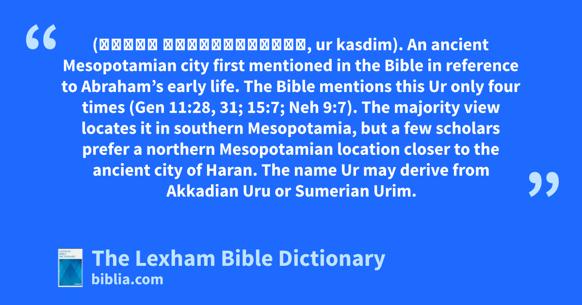Ur (א֣וּר כַּשְׂדִּ֗ים, ur kasdim). An ancient Mesopotamian city first mentioned in the Bible in reference to Abraham’s early life. The Bible mentions this Ur only four times (Gen 11:28, 31; 15:7; Neh 9:7). The majority view locates it in southern Mesopotamia, but a few scholars prefer a northern Mesopotamian location closer to the ancient city of Haran. The name Ur may derive from Akkadian Uru or Sumerian Urim.