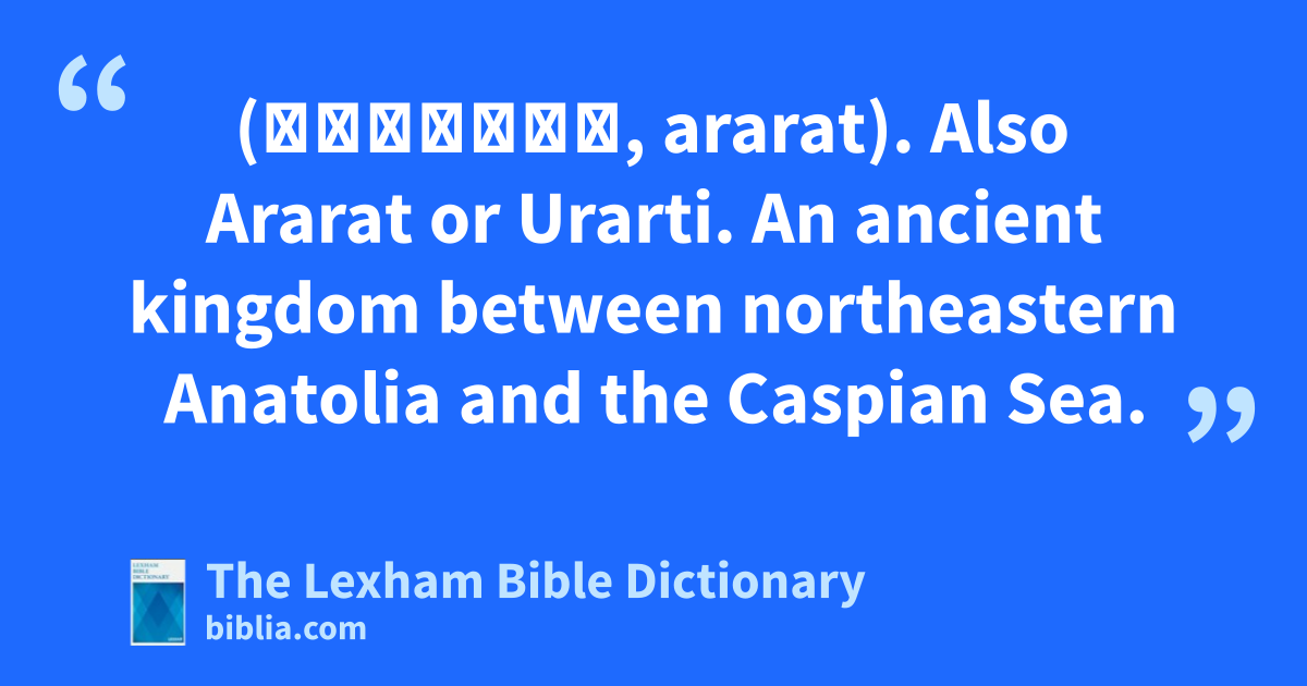 Urartu (אֲרָרָט, ararat). Also Ararat or Urarti. An ancient kingdom between northeastern Anatolia and the Caspian Sea.
