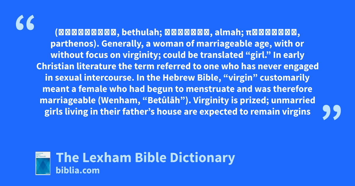 Virgin (בְּתוּלָה, bethulah; עַלְמָה, almah; παρθένος, parthenos). Generally, a woman of marriageable age, with or without focus on virginity; could be translated “girl.” In early Christian literature the term referred to one who has never engaged in sexual intercourse. In the Hebrew Bible, “virgin” customarily meant a female who had begun to menstruate and was therefore marriageable (Wenham, “Betûlāh”). Virginity is prized; unmarried girls living in their father’s house are expected to remain virgins until they are married to a man of their father’s choosing.
