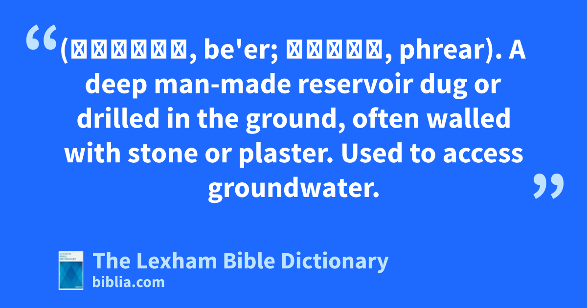 Well (בְּאֵר, be'er; φρέαρ, phrear). A deep man-made reservoir dug or drilled in the ground, often walled with stone or plaster. Used to access groundwater.