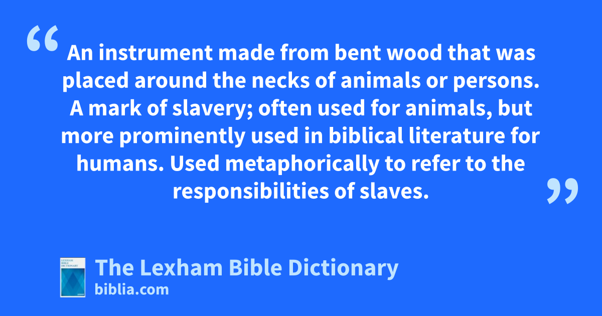 Yoke An instrument made from bent wood that was placed around the necks of animals or persons. A mark of slavery; often used for animals, but more prominently used in biblical literature for humans. Used metaphorically to refer to the responsibilities of slaves.