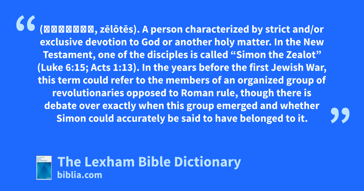 Zealot (ζηλωτής, zēlōtēs). A person characterized by strict and/or exclusive devotion to God or another holy matter.