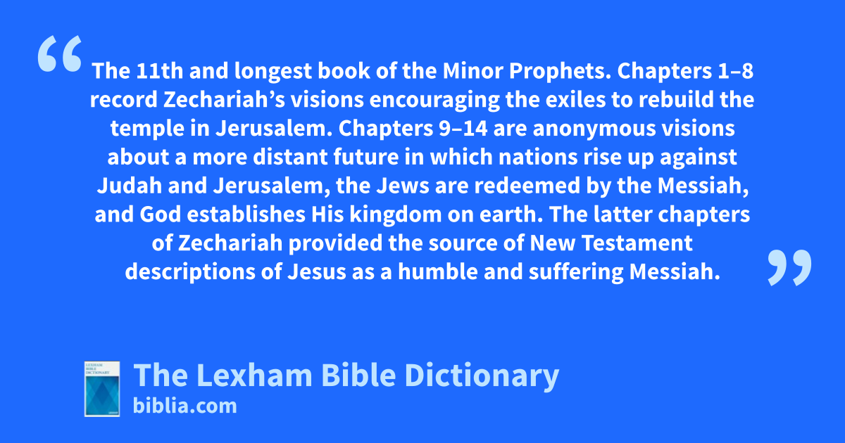 Zechariah, Book Of The 11th and longest book of the Minor Prophets. Chapters 1–8 record Zechariah’s visions encouraging the exiles to rebuild the temple in Jerusalem. Chapters 9–14 are anonymous visions about a more distant future in which nations rise up against Judah and Jerusalem, the Jews are redeemed by the Messiah, and God establishes His kingdom on earth. The latter chapters of Zechariah provided the source of New Testament descriptions of Jesus as a humble and suffering Messiah.