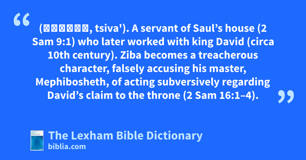 Ziba (צִיבָא, tsiva'). A servant of Saul’s house (2 Sam 9:1) who later worked with king David (circa 10th century). Ziba becomes a treacherous character, falsely accusing his master, Mephibosheth, of acting subversively regarding David’s claim to the throne (2 Sam 16:1–4).