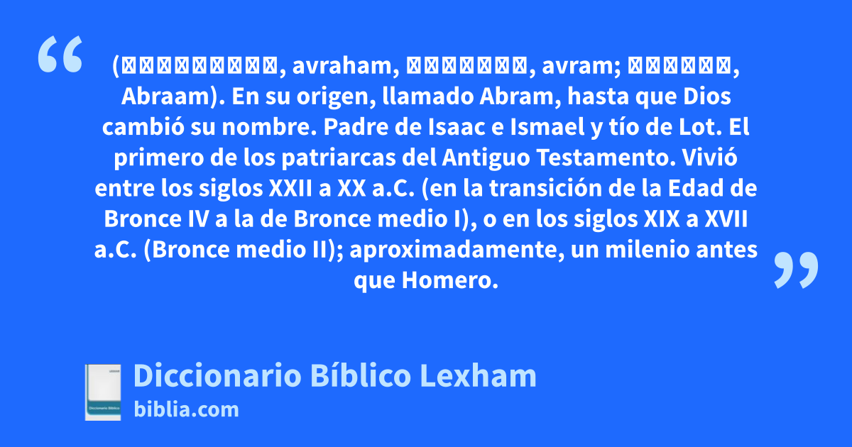 Abraham (אַבְרָהָם, avraham, אַבְרָם, avram; Ἀβραάμ, Abraam). En su origen, llamado Abram, hasta que Dios cambió su nombre. Padre de Isaac e Ismael y tío de Lot. El primero de los patriarcas del Antiguo Testamento. Vivió entre los siglos XXII a XX a.C. (en la transición de la Edad de Bronce IV a la de Bronce medio I), o en los siglos XIX a XVII a.C. (Bronce medio II); aproximadamente, un milenio antes que Homero.