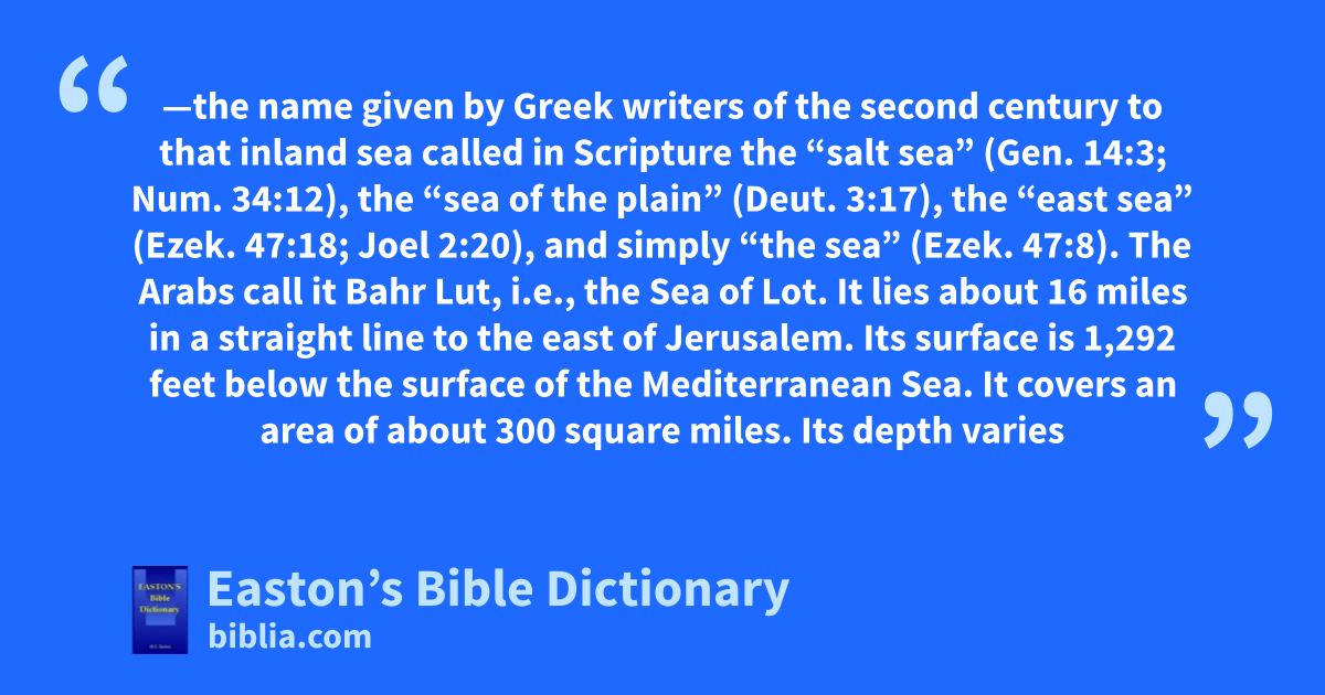 Dead Sea—the name given by Greek writers of the second century to that inland sea called in Scripture the “salt sea” (Gen. 14:3; Num. 34:12), the “sea of the plain” (Deut. 3:17), the “east sea” (Ezek. 47:18; Joel 2:20), and simply “the sea” (Ezek. 47:8). The Arabs call it Bahr Lut, i.e., the Sea of Lot. It lies about 16 miles in a straight line to the east of Jerusalem. Its surface is 1,292 feet below the surface of the Mediterranean Sea. It covers an area of about 300 square miles. Its depth varies from 1,310 to 11 feet. From various phenomena that have been observed, its bottom appears to be still subsiding. It is about 53 miles long, and of an average breadth of 10 miles. It has no outlet, the great heat of that region causing such rapid evaporation that its average depth, notwithstanding the rivers that run into it (see JORDAN), is maintained with little variation. The Jordan alone discharges into it no less than six million tons of water every twenty-four hours.